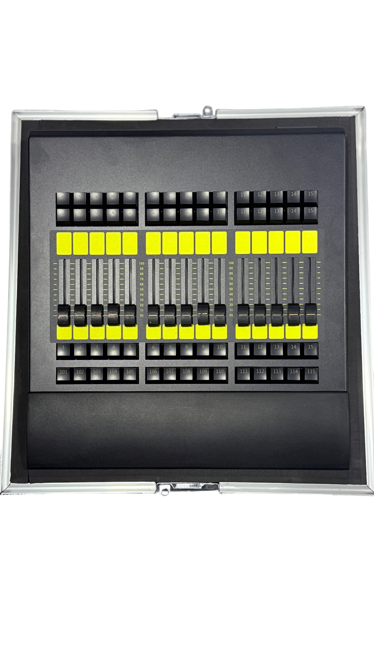 15 faders ejecutores, 45 botones ejecutores, 15 botones ejecutores